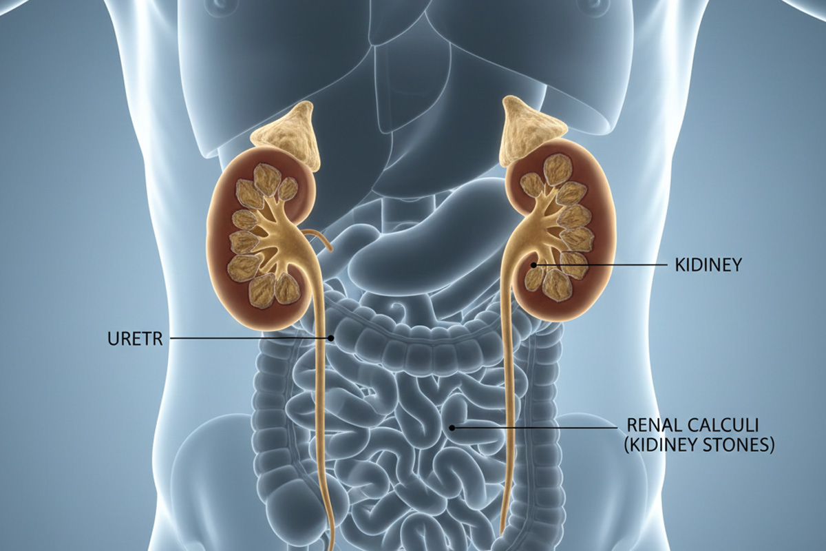 Renal stone is a concretion in the kidney made of various materials, such as uric acid crystals, calcium, or lipids. These concretions, or stones, cause severe pain when they are transported from the kidney into the bladder and out of the body.