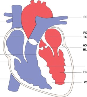 Examples of cyanotic defects are tetralogy of Fallot, transposition of the great arteries, tricuspid atresia, pulmonary atresia, truncus arteriosus and total anomalous pulmonary venous connection.